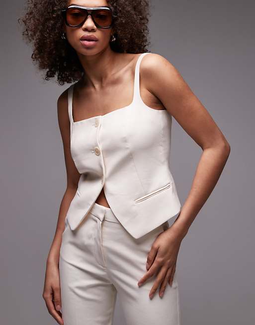 Mango Gilet de costume d’ensemble en tissu aspect lin à encolure carrée Beige