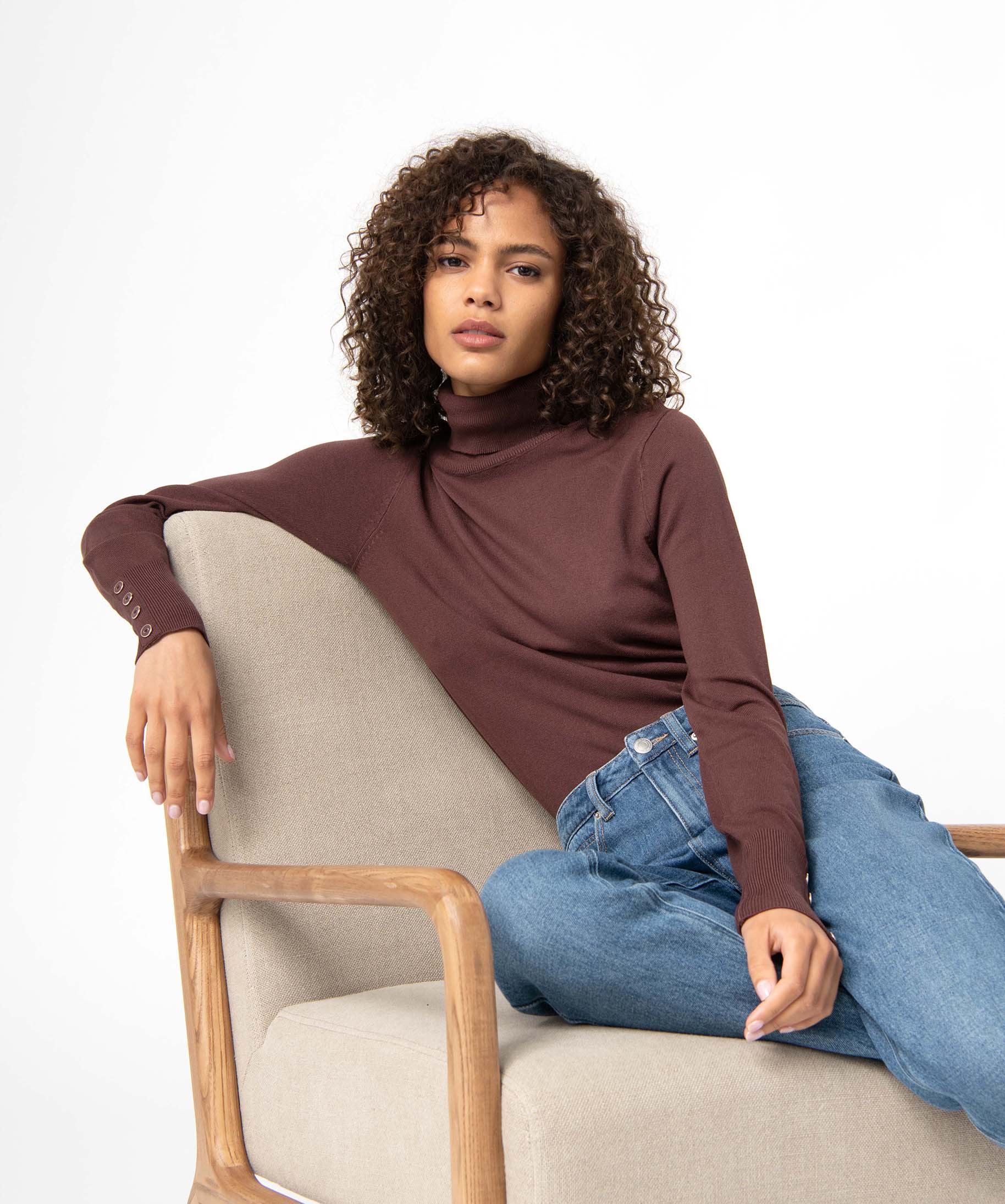Pull femme en maille fine à col roulé marron | GEMO